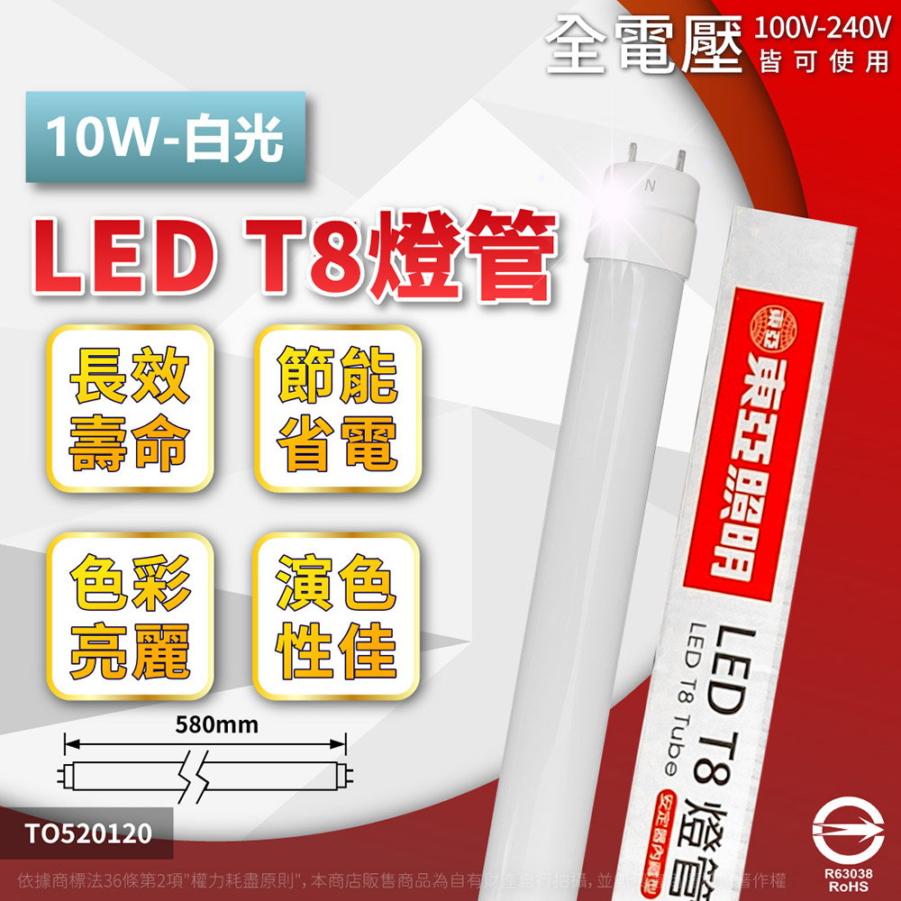 東亞 10W LED T8 燈管 晝光色 6500K 全電壓 20入/箱