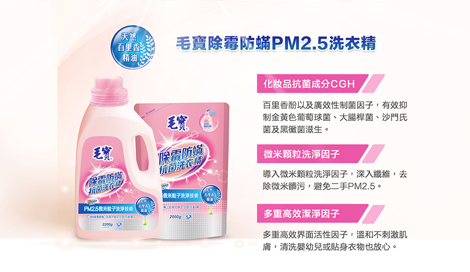 •化妝品抗菌成分CGH 百里香酚以及廣效性制菌因子,有效抑制金黃色葡萄球菌、大腸桿菌、沙門氏菌及黑黴菌滋生 •微米顆粒洗淨因子 導入微米顆粒洗淨因子,深入纖維,去除微米髒污,避免二手PM2.5 •多重高效潔淨因子 多重高效界面活性因子,溫和不刺激肌膚,清洗嬰幼兒或貼身衣物也放心