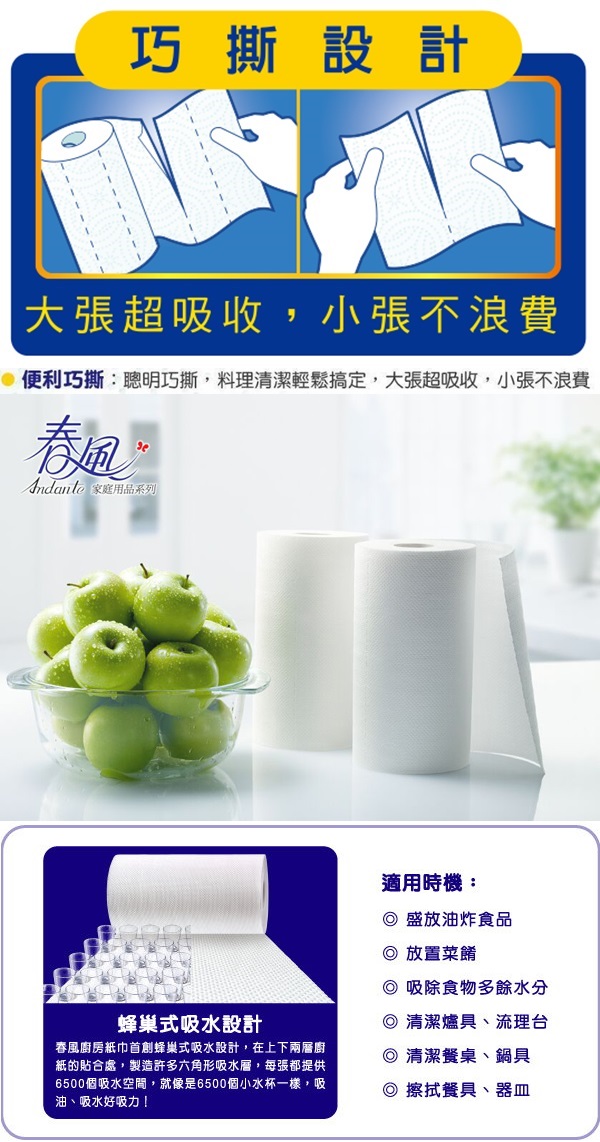 紙有春風最溫柔 ◆產品特色: ◆獨特蜂巢式點對點壓紋,加強吸收效果 ◆6500個吸收空間,超強吸水、吸油力 ◆自動化高溫製程,衛生安全